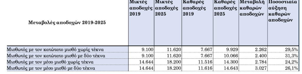 Σωρευτικά, αν συνυπολογιστούν στη μείωση των ασφαλιστικών εισφορών, οι μειώσεις της φορολογίας εισοδήματος και των ασφαλιστικών εισφορών, η κατάργηση της εισφοράς αλληλεγγύης, η αύξηση του αφορολόγητου για οικογένειες με παιδιά και οι αυξήσεις στις αποδοχές (κατώτατος και μέσος μισθός) που εφαρμόστηκαν από το 2019 και μετά, προκύπτει ότι οι καθαρές αποδοχές των εργαζομένων στο διάστημα αυτό αυξήθηκαν κατά 24-31 %, ποσοστά υψηλότερα από τον τιμάριθμο ο οποίος από το 2019 έως τον Ιούλιο του 2024 αυξήθηκε κατά 15,9%. Ακολουθούν ενδεικτικά παραδείγματα εργαζομένων που αμείβονται με τον κατώτατο και το μέσο μισθό. Σημειώνεται ότι ο μέσος μισθός σύμφωνα με τα στοιχεία του Π.Σ. ΕΡΓΑΝΗ αυξήθηκε από 1.046 ευρώ το 2019 σε 1.251 ευρώ το 2023. Για το 2024 η Ευρωπαϊκή Επιτροπή (εαρινές προβλέψεις) προβλέπει αύξηση των κατά κεφαλήν αμοιβών εξαρτημένης εργασίας κατά 4,3%, συνεπώς ο μέσος μικτός μισθός αναμένεται να διαμορφωθεί σε περίπου 1.300 ευρώ.