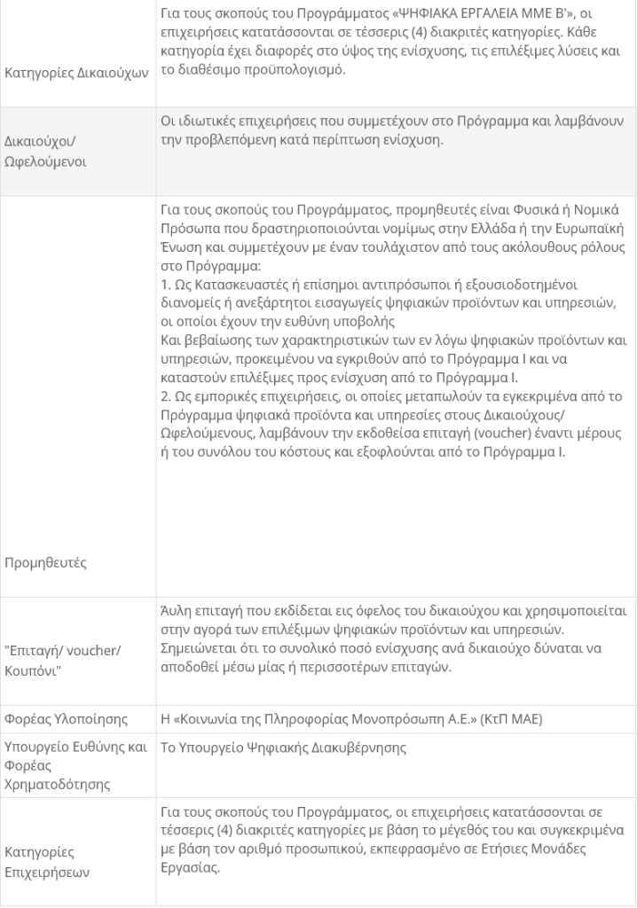 Για τον σκοπό αυτό, το Πρόγραμμα I: «Ψηφιακά Εργαλεία MME» θα παρέχει επιταγές (vouchers) που θα διατεθούν για την απόκτηση, μέσω αγοράς ή μίσθωσης, νέων ψηφιακών προϊόντων και υπηρεσιών.